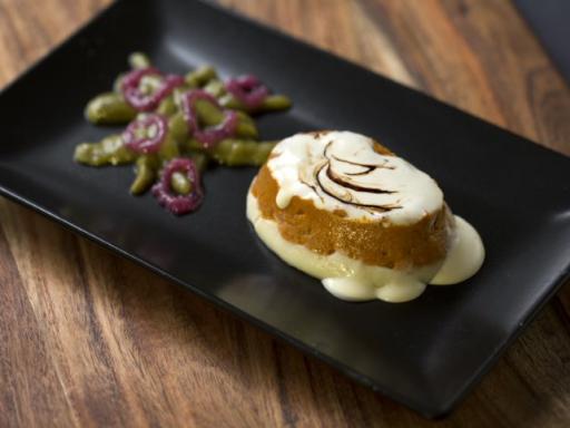 Medister med gule ærter, rugbrød, syltet rødbede og sennep (gratin)