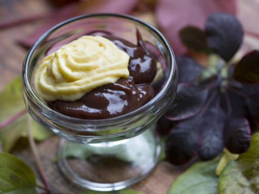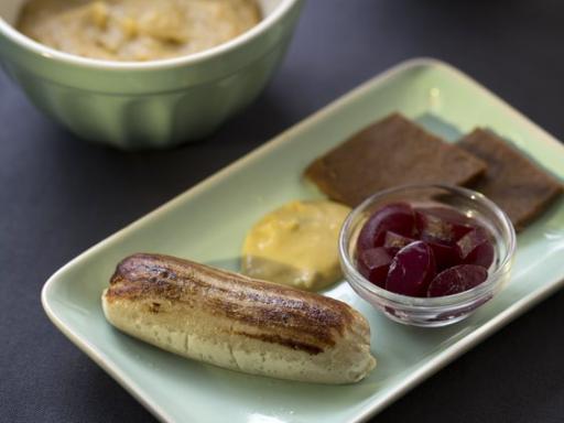 Medister med gule ærter, rugbrød, syltet rødbede og sennep (cremet)